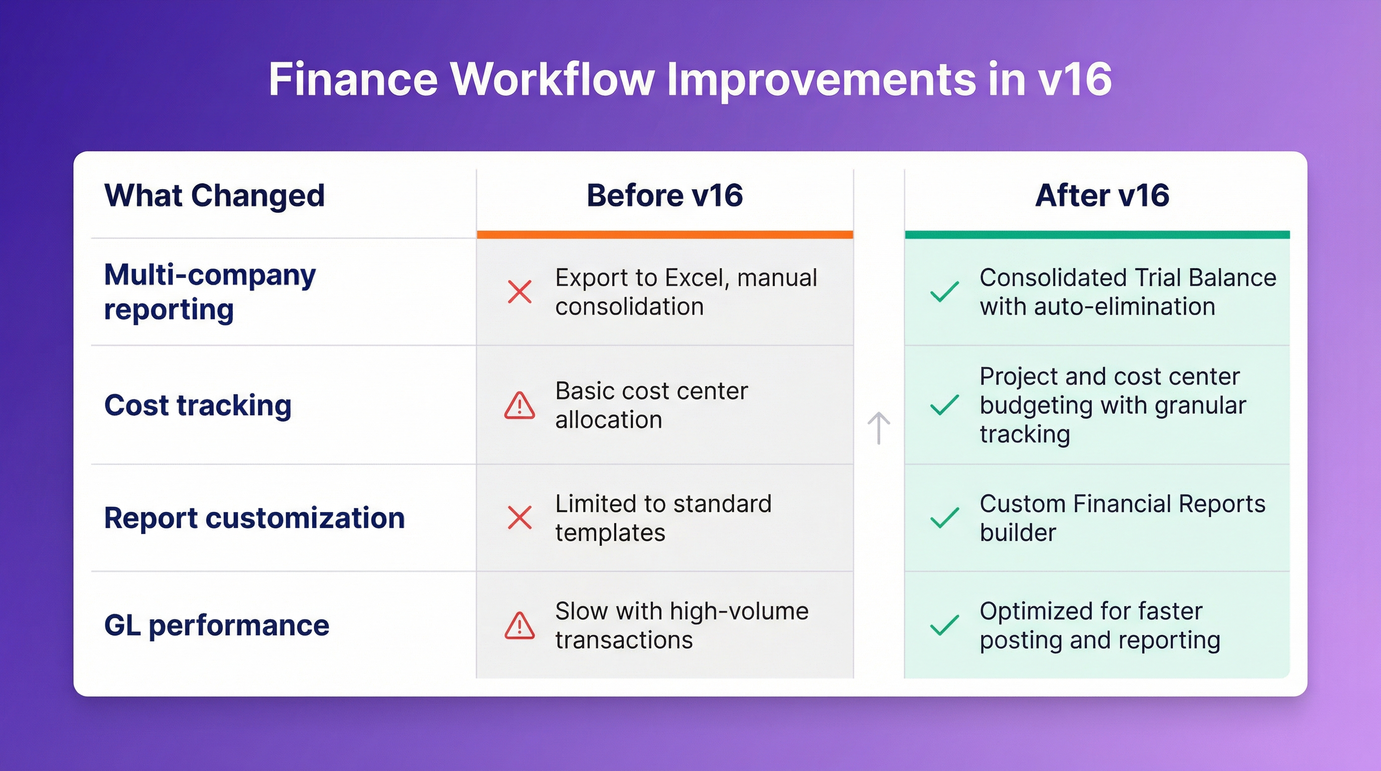 Not everyone needs v16 right now. Upgrade if you manually consolidate reports across multiple companies every month, your manufacturing uses subcontractors or multi-level BOMs regularly, batch tracking issues are causing customer service problems, you're on v13 or earlier, or you're planning major customizations anyway.